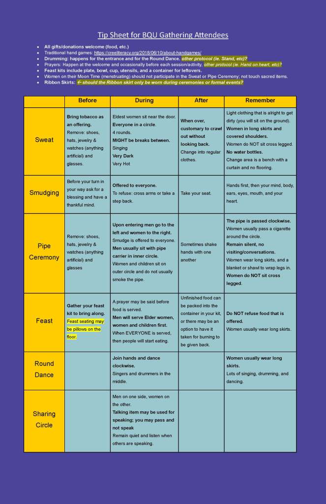 Initially when asked to produce a tip sheet for participants of the gathering at BQU, I thought of putting all the information in a table. My theory being that the participants are all coming from a colonial-style education system, and this would help them understand and feel more comfortable reading the information.