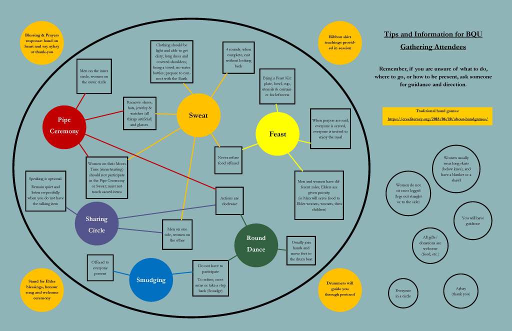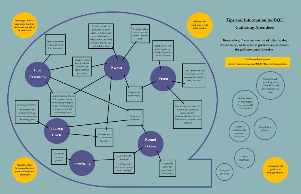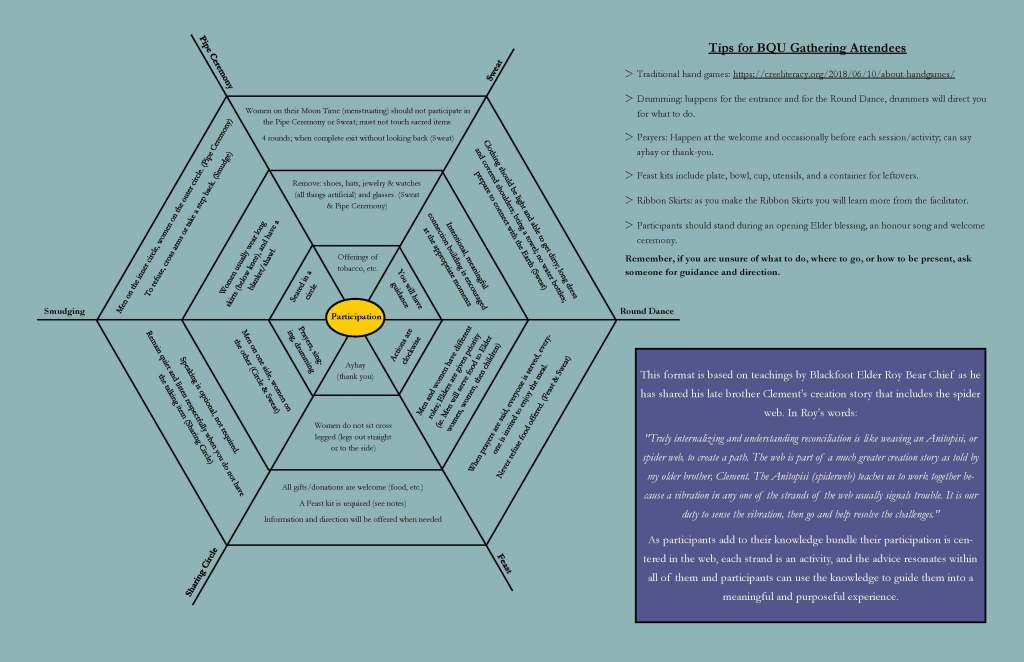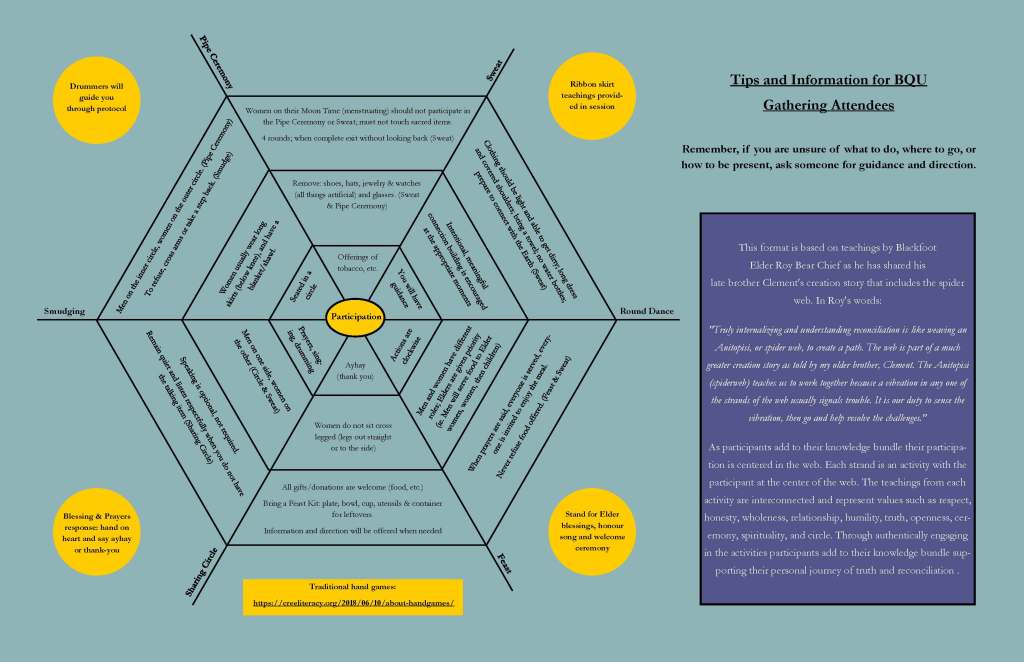 The ‘ah-ha’ moment was after signing out multiple books from both the MRU library and the public library, I was reading the idea behind the cover art on a book. They said that they chose a motherboard because everything is connected. My mind immediately went to the spiderweb that Elder Roy Bear Chief had introduced to us in our orientation class. So I completely revamped the tip sheet and after Susan reviewing it, I made the relevant changes.